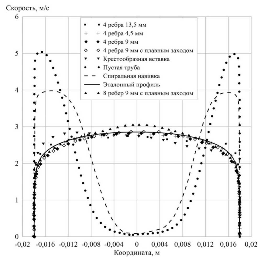 В качестве «эталона» на графике приведен профиль турбулентного потока в круглой трубе [6] при заданной средней скорости. Из графика видно, что профиль скорости в канале без вставки и в канале со спиральной навивкой существенным образом отличается от «эталонного» профиля. Применение других видов выпрямителей потока позволяет приблизить профиль скорости к «эталонному» виду, при этом наибольшую сходимость показывают модели с высотой ребра 9 мм, как с прямыми ребрами, так и с плавным входом.