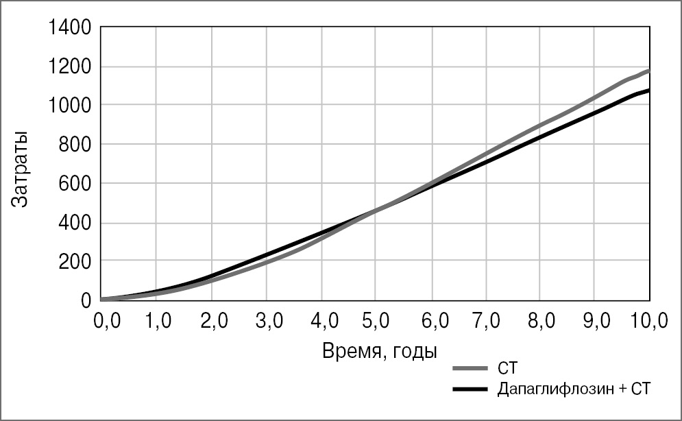 Стоит отметить, что при анализе общих затрат на 1 пациента начиная с 5-летнего периода терапия, включающая дапаглифлозин, начинает быть доминирующей в плане экономической выгоды над СТ ХБП (рис. 1).