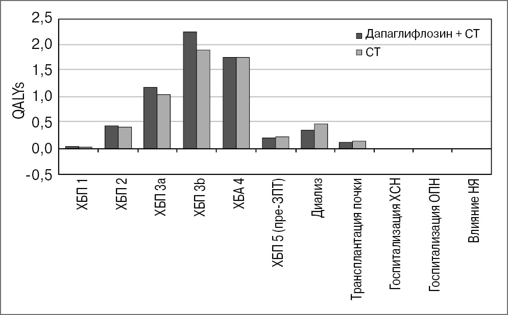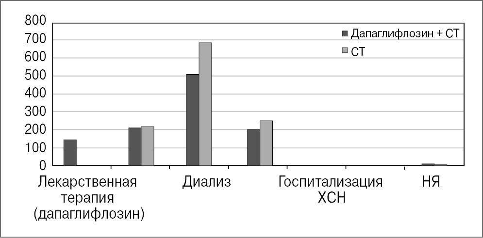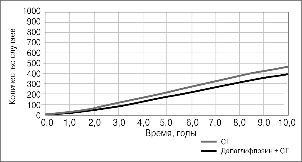 Заключение. Применение дапаглифлозина в дополнение к СТ для терапии пациентов с ХБП 2–4-й стадий в долгосрочном горизонте (10 лет) позволяет продлить пребывание на преддиализных стадиях ХБП на 8 мес в среднем на 1 пациента. Схема терапии дапаглифлозин + СТ в когорте 1 тыс. пациентов с ХБП 2–4-й стадий на горизонте 10 лет позволит избежать 30 случаев госпитализаций по причине сердечной недостаточности (число больных, которых необходимо пролечить, чтобы предотвратить 1 неблагоприятный исход, – namber needed to treat – NNT – 34), 59 случаев острого повреждения почек (NNT – 18), 73 случая смерти по всем причинам (NNT – 14).
