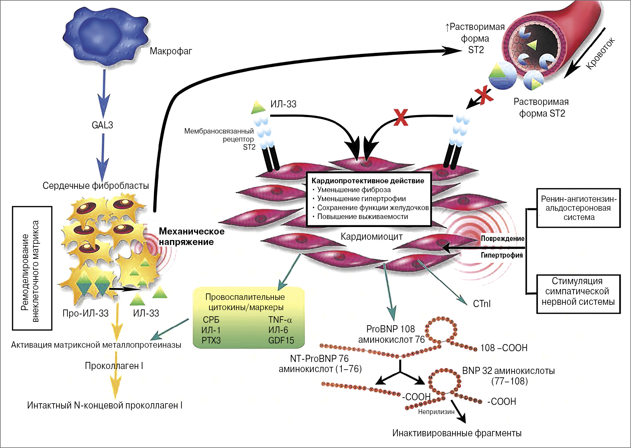 Поиск новых биологических маркеров, анализ патофизиологической роли и изменения их концентрации при разных вариантах лечения позволили понять многие патогенетические особенности развития и течения ХСН [1]. За последние десятилетия достигнут значительный прогресс в изучении сердечно-сосудистых биомаркеров. Ключевым стало внедрение в широкую клиническую практику исследования концентрации натрийуретических пептидов (НУП), используемых в качестве маркеров для диагностической и прогностической оценки пациентов с ХСН [4]. В настоящее время оценка значений мозгового НУП (BNP) и его N-концевого предшественника (NT-proBNP) является «золотым стандартом» для диагностики ХСН и прогнозирования ее течения, однако ограничения, которые обусловлены влиянием многих факторов на показатели NT-proBNP, неоднозначность пороговых уровней и низкая информативность при СН с сохраненной фракцией выброса левого желудочка (ФВ ЛЖ) диктуют необходимость дальнейшего поиска высокочувствительных и более специфичных маркеров [1, 4].