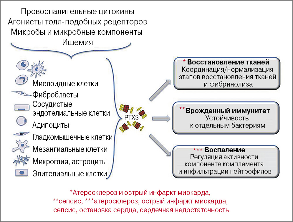 Фактически короткие и длинные пентраксины продуцируются разными типами клеток в ответ на разные стимулы и обладают разными молекулярными мишенями. Короткоцепочечные вырабатываются преимущественно печенью и индуцируются провоспалительными цитокинами, в основном ИЛ-6 [9]. Основными источниками PTX3 являются сосудистые эндотелиальные клетки, моноциты, макрофаги, альвеолярные клетки, миелоидные дендритные клетки, адипоциты, фибробласты, гладкомышечные клетки, хондроциты и синовиальные клетки (рис. 2) [10].