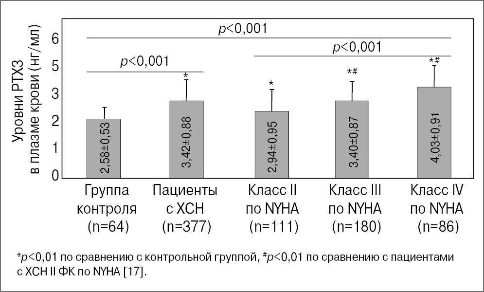 Недавние исследования выявили, что уровни PTX3 повышаются у пациентов с ХСН по мере увеличения ФК по NYHA. В рамках исследования была оценена экспрессия PTX3, NT-proBNP и СРБ в крови больных с СН и в группе здоровых добровольцев того же возраста. Экспрессия PTX3 была значительно выше у пациентов с СН на разных стадиях заболевания по сравнению со здоровыми людьми. Не было обнаружено статистически значимых отклонений уровней СРБ между группами, в то время как уровни NT-proBNP повышались в зависимости от тяжести заболевания (NYHA II ФК – 717±41 пг/мл, NYHA III/IV ФК – 2764±572 пг/мл; p=0,03), а также по сравнению с группой контроля (0–155 пг/мл) [19].