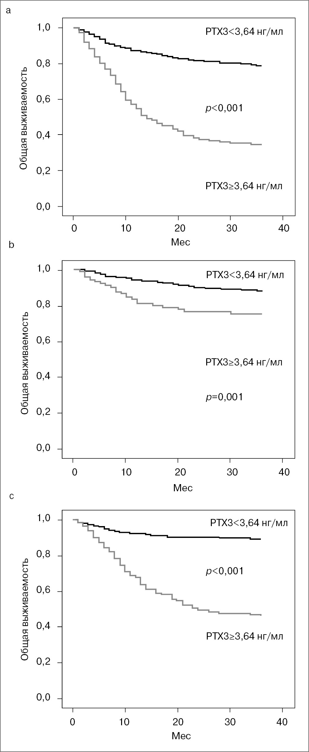 Рис. 4. Анализ Каплана–Мейера для всех ССС (a), кардиальных смертей (b) и повторной госпитализации (c) в соответствии с верхней границей нормы уровня PTX3 в плазме крови (3,64 нг/мл) [17].