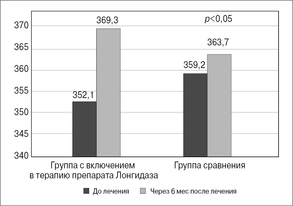 У исследуемых групп применялся легкий и удобный способ определения степени толерантности к физической нагрузке – тест 6-минутной ходьбы. Оценивали расстояние, которое пациент проходил в течение 6 мин в удобном для него темпе. При включении в терапию Лонгидазы пройденное расстояние увеличивалось быстрее, чем в группе сравнения (рис. 1).
