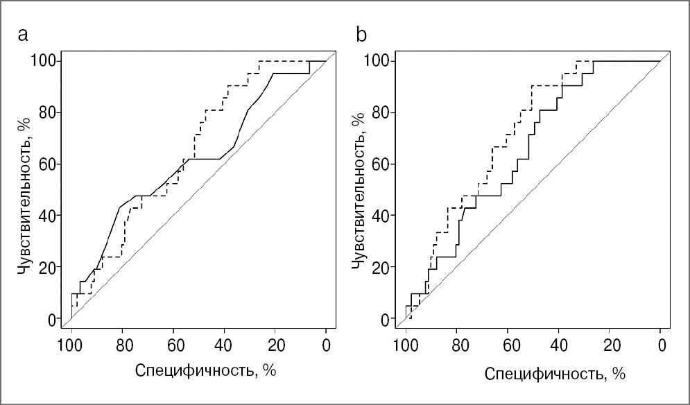 Рис. 1. ROC-кривые, характеризующие прогностическую значимость антропометрических показателей (сплошная линия – ОТ/ОБ, пунктирная – ОТ/рост): a – ROC-кривые для предсказаний однофакторных моделей; b – ROC-кривые для предсказаний многофакторных моделей.