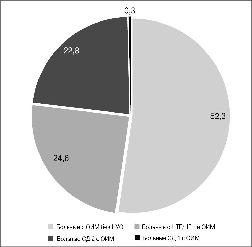 Как представлено на рис. 1, в структуре ОИМ больные СД 2 с ОИМ составляют 22,8%, пациенты с НТГ/НГН и ОИМ – 24,6% и больные СД 1-го типа (СД 1) с ОИМ – 0,3%. Обращает внимание, что в отделении неотложной кардиологии почти 1/2 больных с ОИМ имели НУО разной степени выраженности, в том числе СД 2.
