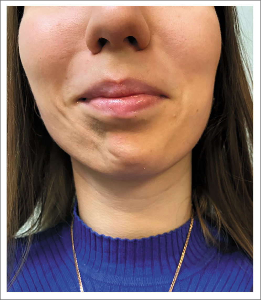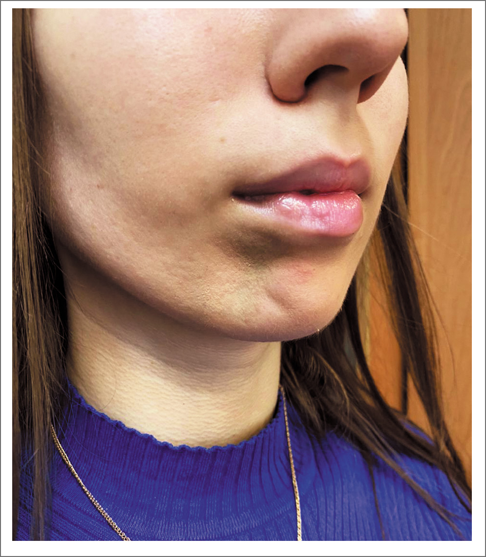 St. localis: процесс на лице носит асимметричный характер, локализуется на правой половине лица в области дуги нижней челюсти. Представлен очагом атрофии неправильной формы длиной 3,5 см и шириной до 1 см, имеет вытянутые очертания и западения (до 4 мм) в центральной части по типу линейного рубца с явлениями гиперпигментации по периферии в верхней части. Подкожная жировая клетчатка и подлежащие мимические мышцы вовлечены в патологический процесс и истончены, что привело к асимметрии нижней части лица справа. Кожа в очаге поражения натянута, сухая, спаяна с подлежащими тканями. Отмечается деформация красной каймы губ справа в виде сужения по сравнению со здоровой половиной. Функция мимических мышц не нарушена, расстройства чувствительности не наблюдается (рис. 1, 2).