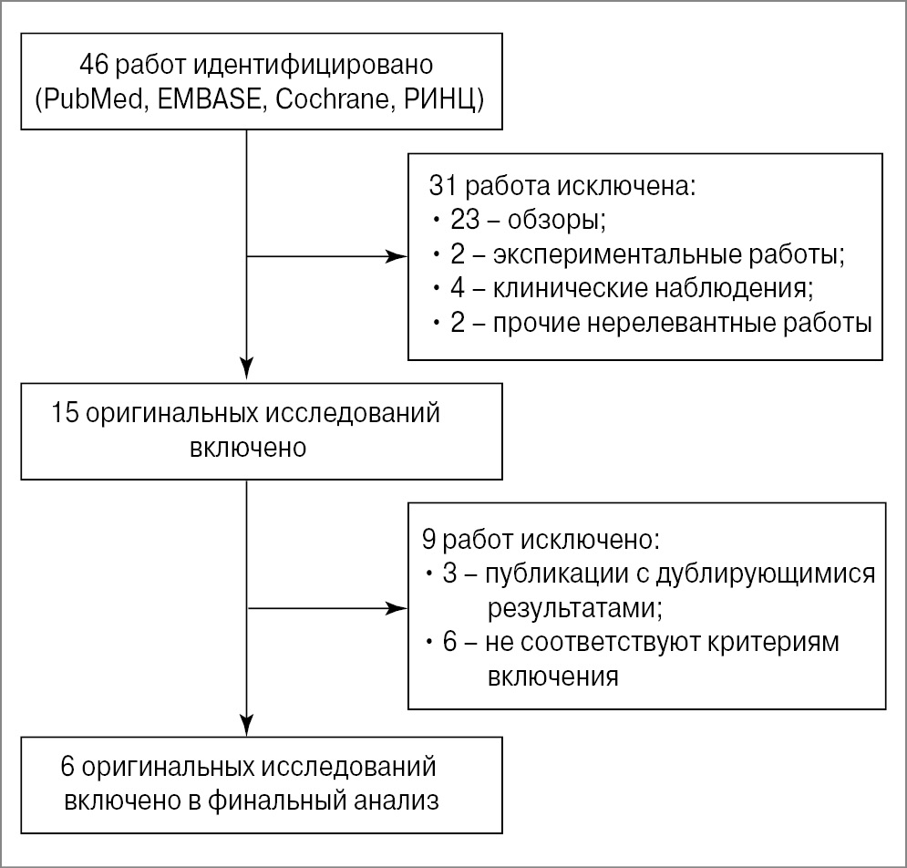 Поиск по электронным базам данных выявил 46 работ для последующего анализа. Из них было исключено 31 неоригинальное исследование (23 – обзоры; 2 – экспериментальные исследования; 4 – клинические примеры; 2 – прочие нерелевантные работы). Отобранные 15 работ детально анализировались на соответствие критериям включения и наличие дублирования в других базах данных, после чего 9 исследований было исключено (рис. 1). В итоге 6 оригинальных исследований было включено в настоящий метаанализ (табл. 1) [16–21].