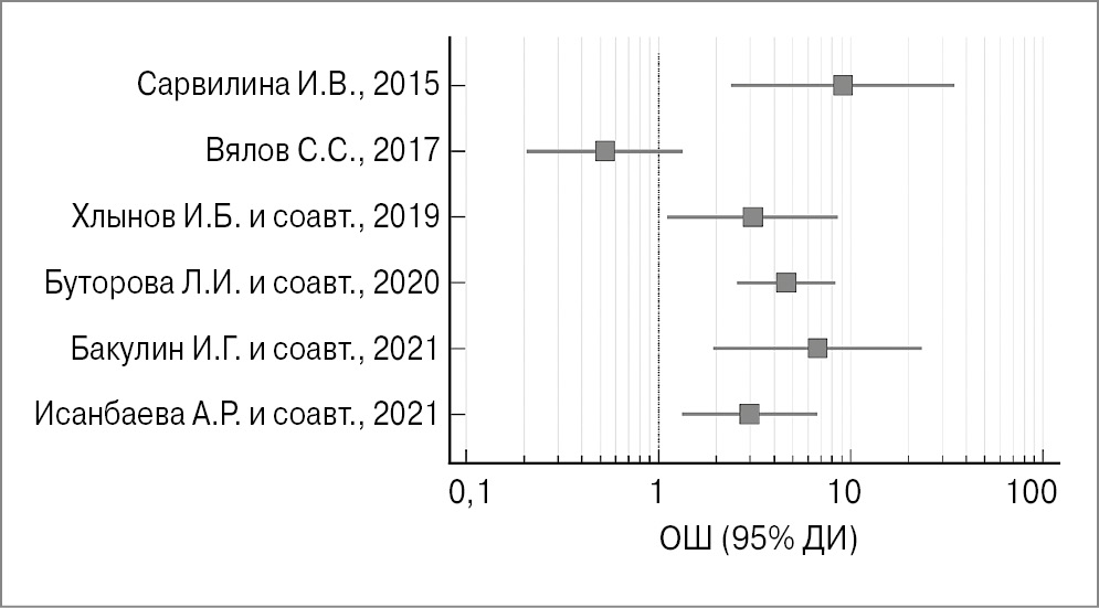 Статистическая обработка данных осуществлялась с помощью специального программного обеспечения MedCalc 20.026 (Бельгия) в среде Microsoft Windows 11 (США). Результаты представлены в виде отношения шансов (ОШ) и 95% доверительного интервала (95% ДИ) полного разрешения БС в сравниваемых группах. Гетерогенность между различными работами оценивалась при помощи Cochrane’s Q-критерия и I2-критерия. При результатах р<0,05 и I2>50 констатировалось наличие значимой гетерогенности. Вероятность наличия публикационной ошибки оценивалась при помощи построения воронкообразной диаграммы рассеяния, а также расчета корреляционного теста Бегга–Мазумдара и теста регрессии Эггера.