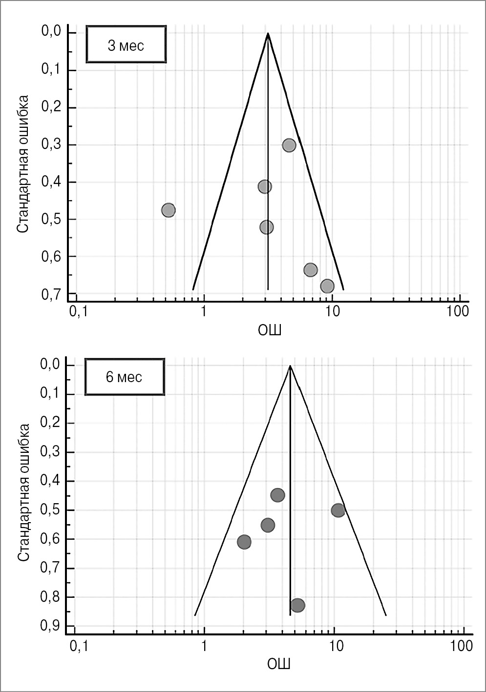 Вероятность наличия публикационного смещения оценена при помощи построения воронкообразной диаграммы рассеяния, а также расчета теста Бегга–Мазумдара и теста регрессии Эггера как для 3-месячной, так и 6-месячной терапии. При визуальном анализе воронкообразных диаграмм рассеяния (рис. 3) существенной асимметрии выявлено не было. Помимо этого, наличие значимого публикационного смещения было исключено по результатам теста Бегга–Мазумдара (3 мес, p=0,3476; 6 мес, p=0,6242) и теста регрессии Эггера (3 мес, p=0,9713; 6 мес, p=0,8143).