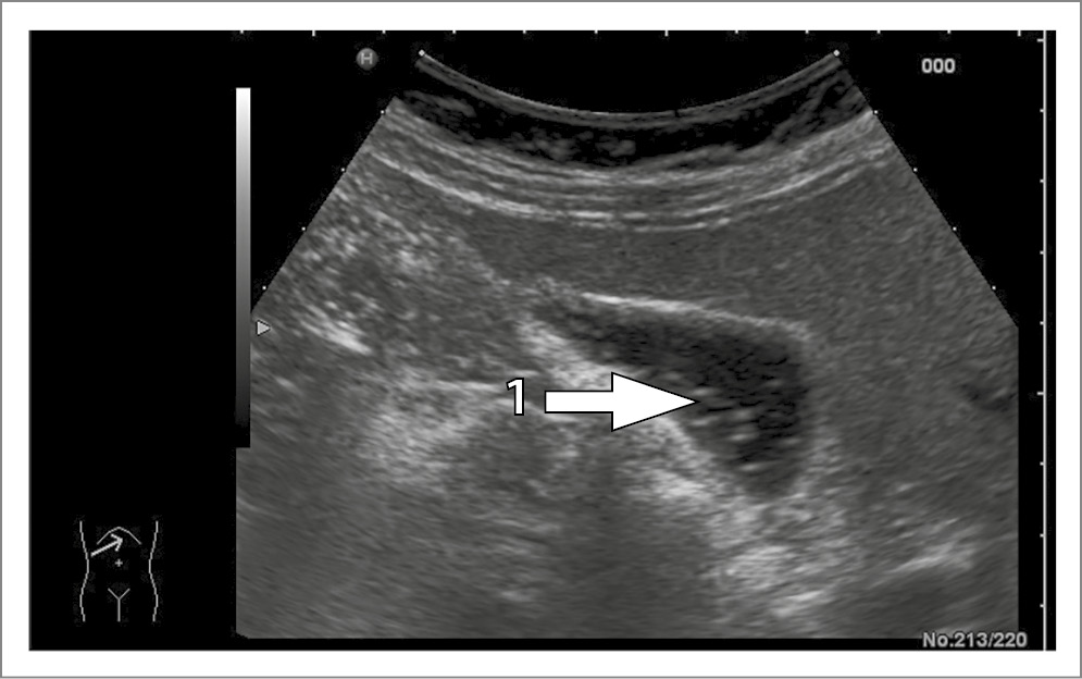 Рис. 4. Билиарный сладж 1-го типа: 1 – гиперэхогенные включения в полости желчного пузыря.
