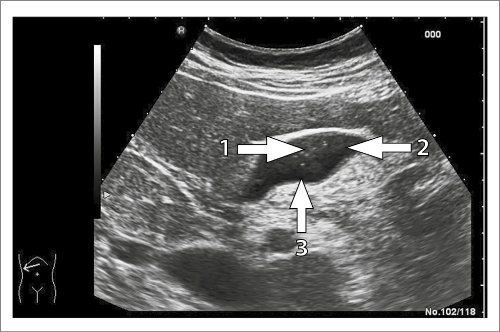 Рис. 5. Билиарный сладж 3-го типа: 1 – гиперэхогенные включения; 2 – сгустки эхонеоднородной желчи; 3 – слой менее густой, более однородной желчи.