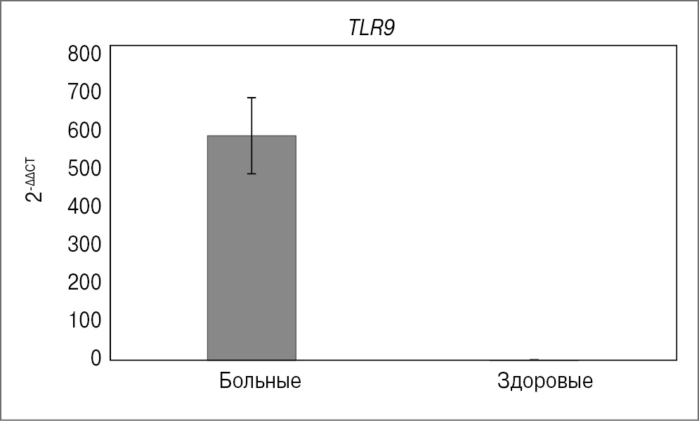 Сравнивая уровни экспрессии генов у больных ПА и здоровых волонтеров, выявили, что уровень экспрессии TLR9 у больных ПА в 591 раз превышает таковой у здоровых волонтеров (рис. 1).