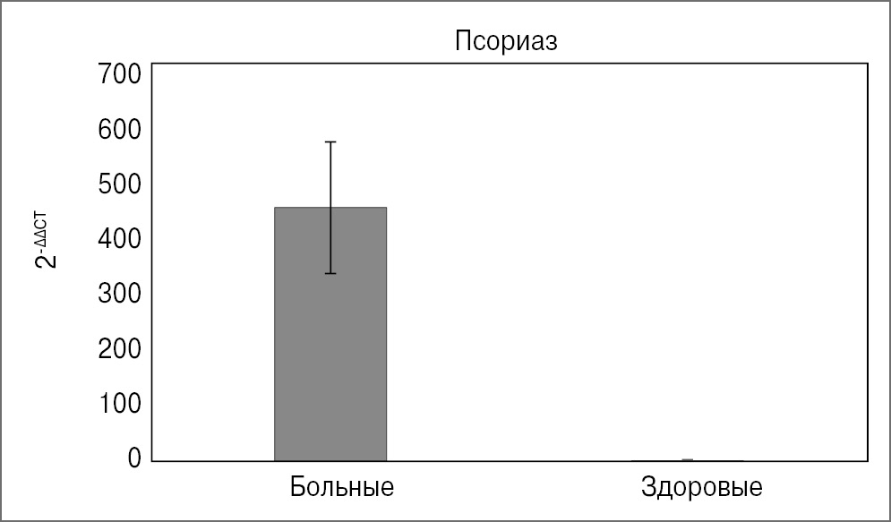 Уровень экспрессии TLR9 у больных псориазом без поражения суставов также значительно превышал (в 462 раза) таковой у здоровых волонтеров (рис. 2).
