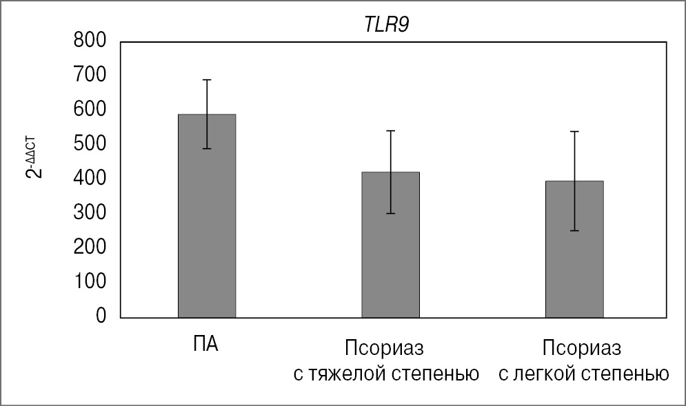 Materials and methods. Mononuclear cells were isolated from the peripheral blood of 31 patients with psoriasis vulgaris without joint involvement, 45 patients with PA, and 20 healthy volunteers. TLR9 gene expression was analyzed by real-time polymerase chain reaction.