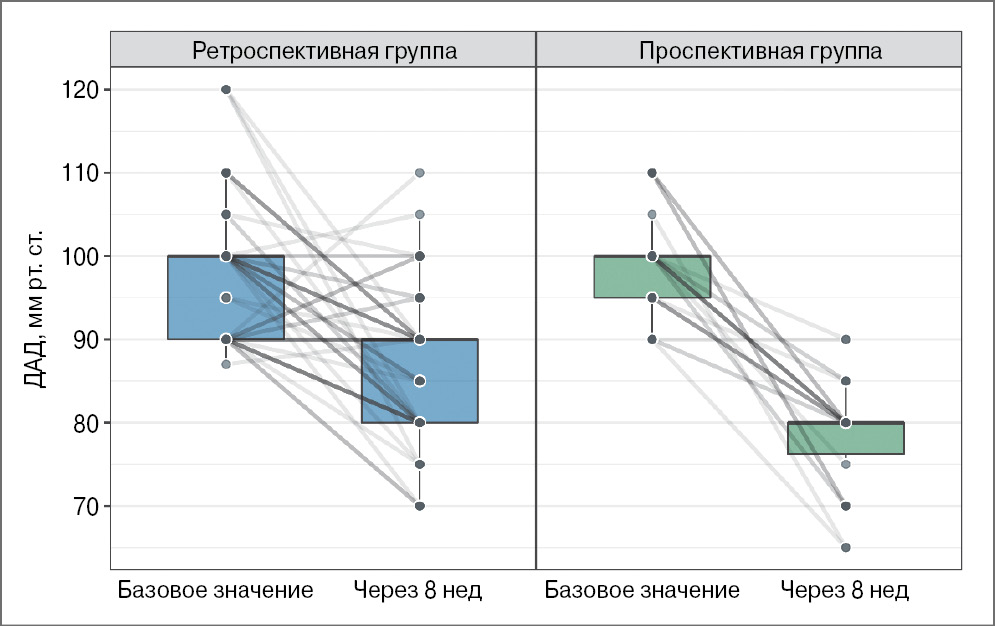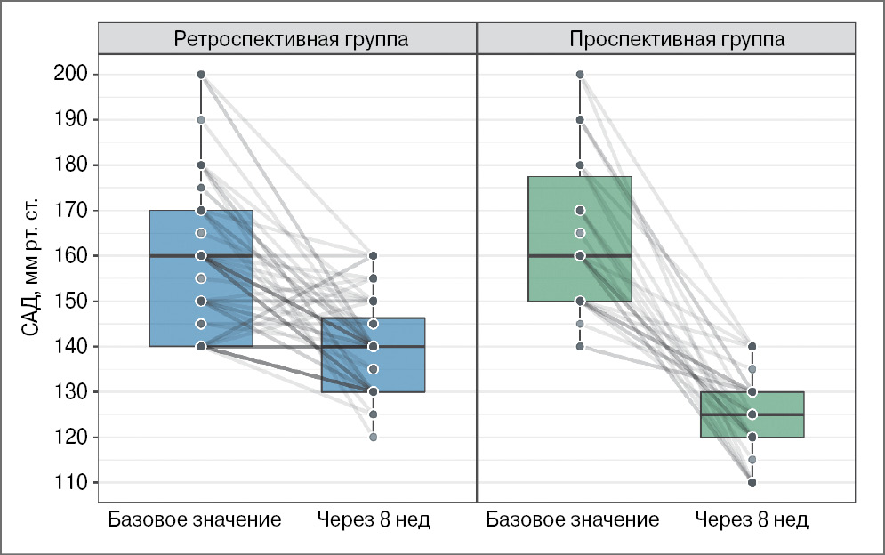 Следует отметить, что, хотя исходно в ретроспективной группе пациенты имели более выраженное ожирение по сравнению с участниками из проспективной группы, мы не отметили корреляции между исходной массой тела и тяжестью АГ, а также значимых различий между группами по коморбидному фону.