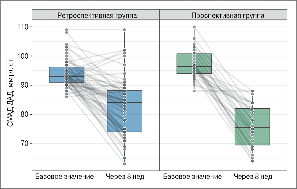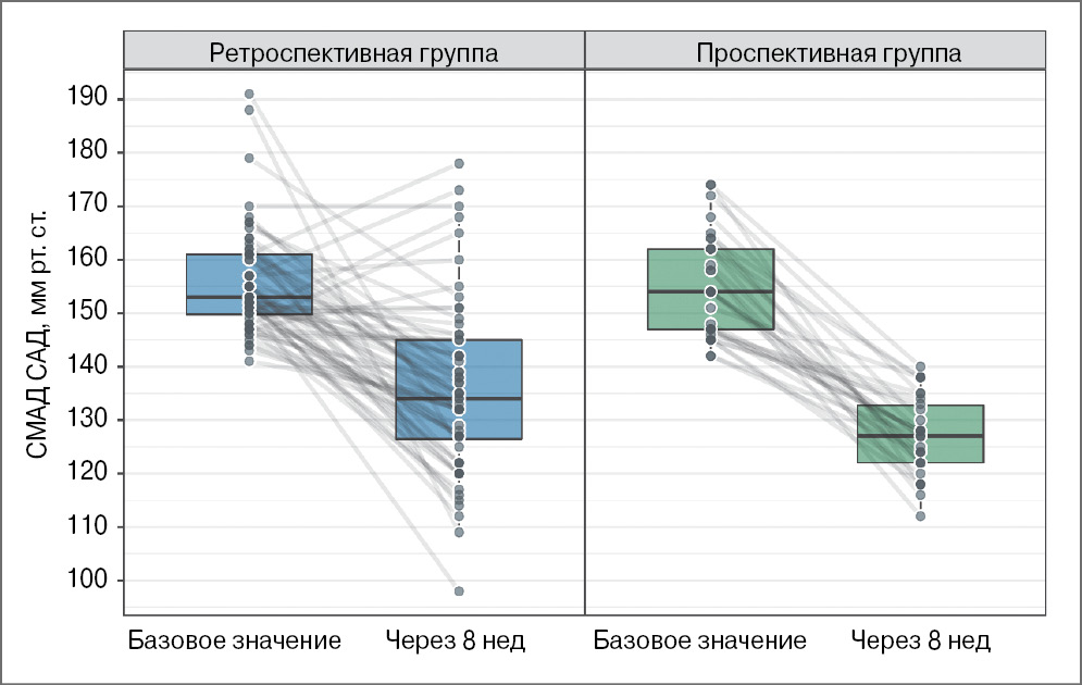 Заключение. Регулярная обратная связь и индивидуализированный подбор терапии с акцентом на современные метаболически нейтральные препараты с максимальной продолжительностью действия привели в проспективной группе к лучшему контролю АД, повышению приверженности терапии и достоверному снижению массы тела.
