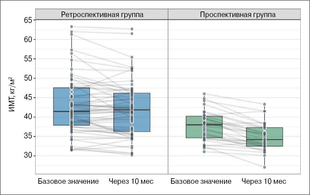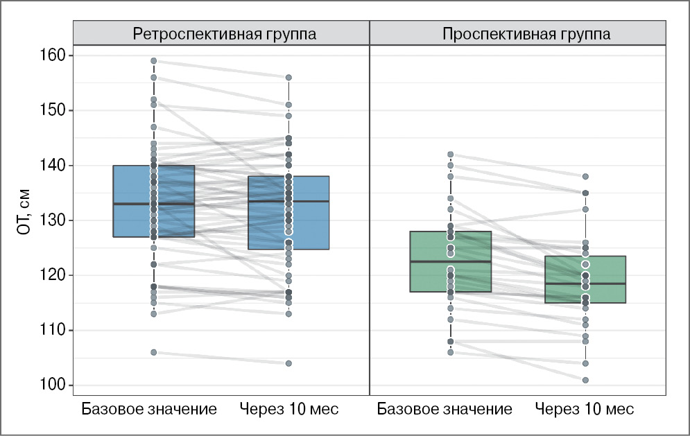 Хотя в данном исследовании снижение массы тела у пациентов не являлось непосредственной задачей, через 10 мес от начала исследования мы отметили, что за период исследования у участников из проспективной группы достоверно уменьшился ИМТ (на 7,7%) и ОТ (на 3,2%), p<0,05. В свою очередь в ретроспективной группе статистически значимых различий не выявлено (табл. 9, рис. 5, 6).