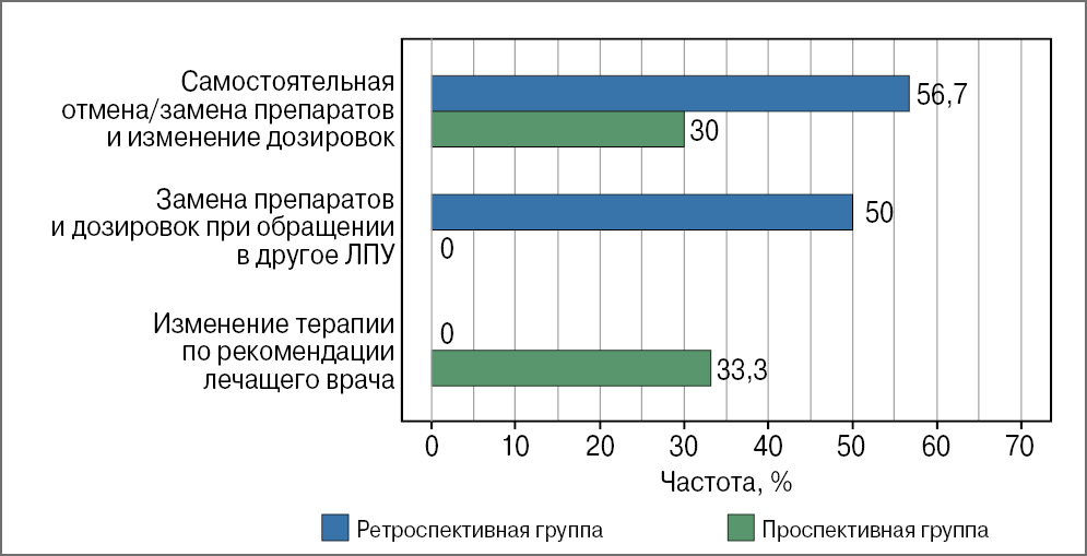 Интересно, что при самостоятельном изменении схемы терапии пациенты из проспективной и ретроспективной групп руководствовались разными мотивами. Так, если в ретроспективной группе участники часто сообщали о нежелании принимать много таблеток, выражали негативное отношение к диуретикам, прекращали прием препаратов по экономическим соображениям, а также стремились принимать одинаковые медикаменты с родственниками и знакомыми, то в проспективной группе основной причиной самостоятельной отмены тех или иных препаратов становилась субъективная плохая переносимость целевых значений АД.