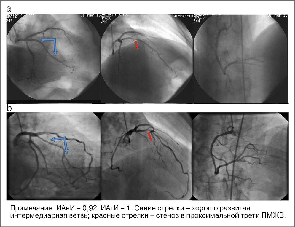 Рис. 1. Сравнение коронарографий пары сибсов: a – старший брат; b – младший брат.