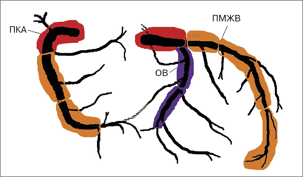 H. Sunman и соавт. [20] обследовали пациентов (n=349, средний возраст – 57,8±10,8 года) с помощью МСКТ коронарных артерий по поводу подозрения на ИБС и обнаружили, что наследственная отягощенность по ССЗ связана с более высокой частотой ИБС и предрасположенностью к стенозу ПМЖВ (79,8% против 58,0%, p=0,013) и ОВ (42,3% против 30,4%, p=0,021) ЛКА.