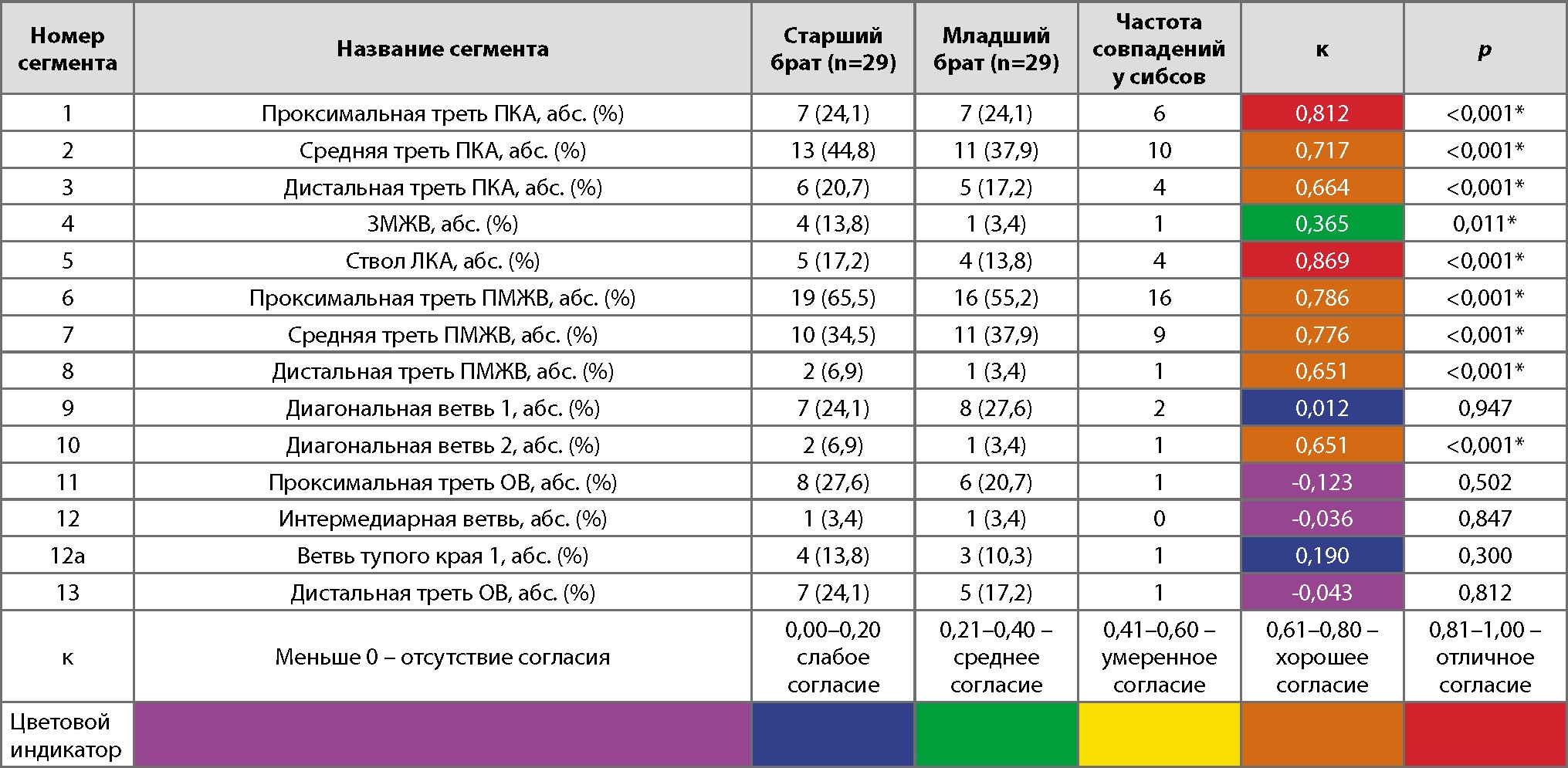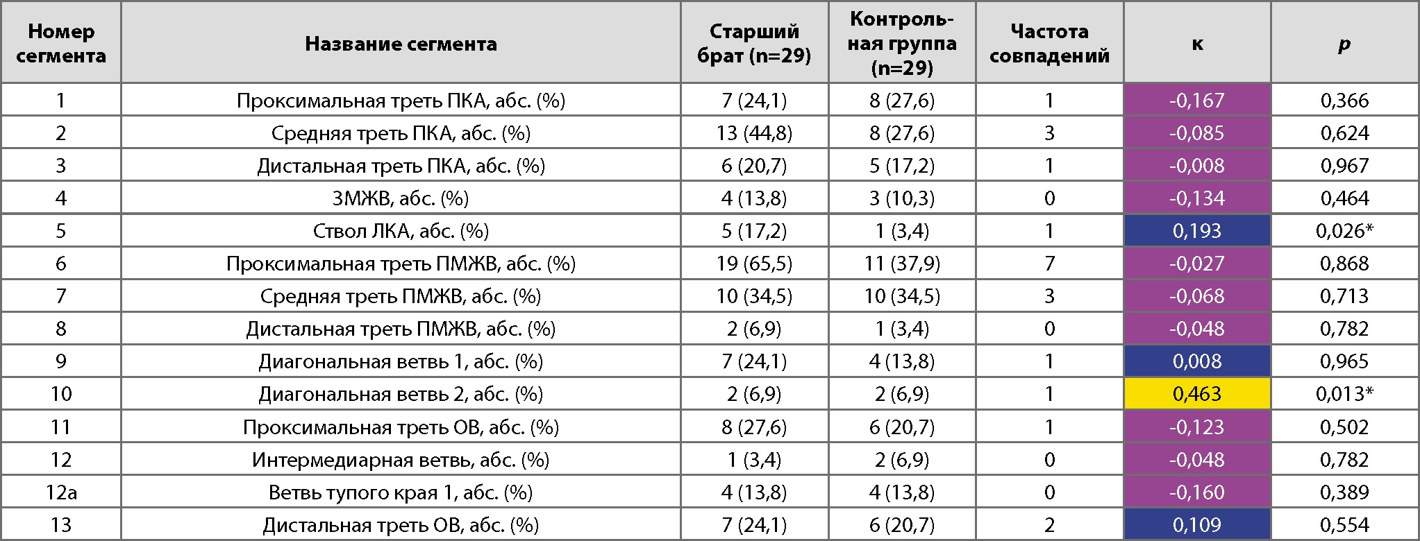 Таблица 3. Частота согласия атеросклеротического поражения сегментов коронарных артерий в парах братьев