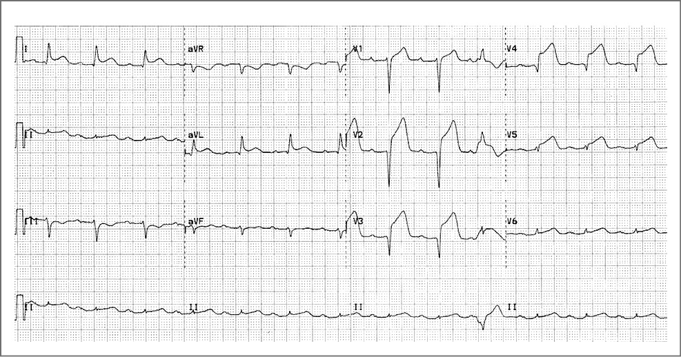 24 марта 2022 г. пациент госпитализирован с жалобами на одышку в покое. За сутки до госпитализации появилась интенсивная боль в грудной клетке, купируемая наркотическими анальгетиками, на ЭКГ – увеличение амплитуды зубцов Т в грудных отведениях VI–VIV. В стационаре отмечалось рецидивирование ангинозного синдрома, повышение уровня кардиоспецифических ферментов. На ЭКГ – элевация сегмента ST и формирование зубца Q в VII–V, элевация ST в I и aVL (рис. 1). По данным коронароангиографии выявлен субтотальный стеноз (90%) проксимального отдела передней нисходящей артерии (ПНА), выполнено успешное стентирование ПНА с позиционированием стента с лекарственным покрытием. Несмотря на успешную реваскуляризацию, у пациента имели место проявления СН. По данным ЭхоКГ на 3-и сутки госпитализации отмечались снижение сократительной способности миокарда ЛЖ за счет гипо- и акинезии передней стенки ЛЖ (ФВ ЛЖ 34%) и проявления легочной гипертензии (систолическое давление в легочной артерии – СДЛА 45 мм рт. ст.). На рентгенограмме легких отмечались признаки венозного застоя 2-й степени.