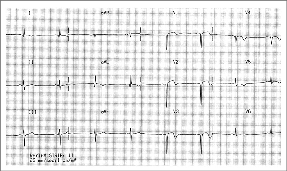 Рис. 1. ЭКГ пациента М. Ритм синусовый, ЧСС 75 уд/мин.