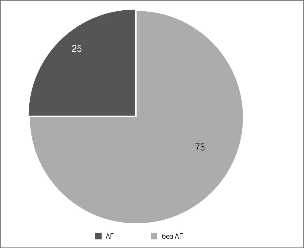 Как показано на рис. 1, АГ зарегистрирована у 25% пациентов с преобладанием распространенности среди мужчин (15%).
