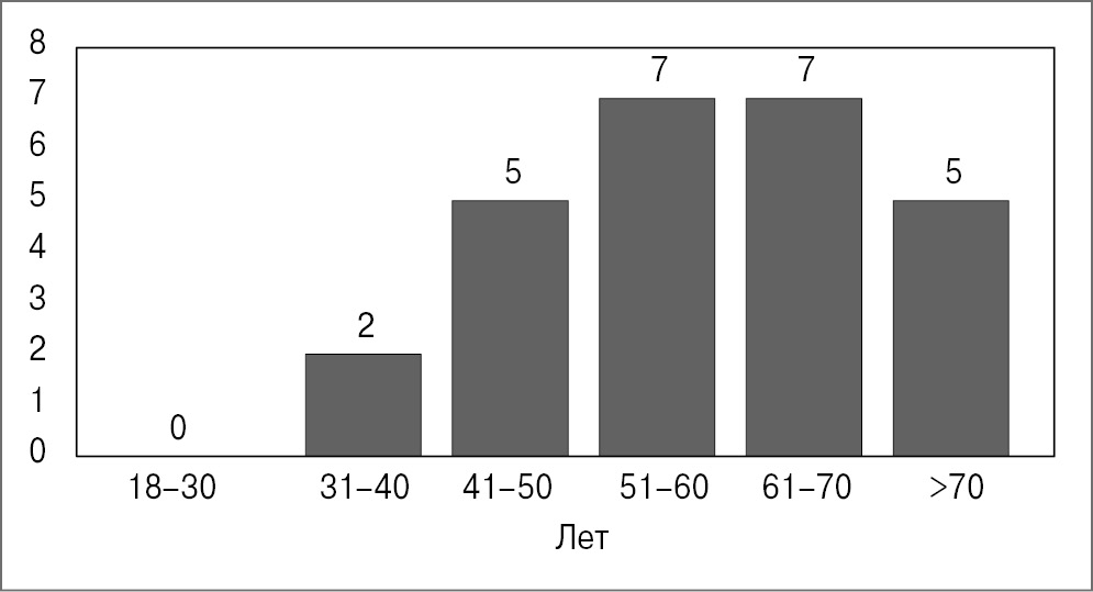 Распространенность АГ прямо пропорциональна тяжести течения псориаза (13% с АГ у пациентов с псориазом тяжелого течения, 12% с АГ с псориазом среднего течения, 2% с АГ с псориазом легкого течения соответственно). Большее число пациентов с АГ отмечалось среди пациентов старше 40 лет (рис. 2). Среди пациентов с псориатическим артритом зарегистрирован 1 (2%) пациент с АГ.