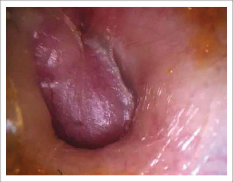 Рис. 1. Отоскопическая картина. За барабанной перепонкой определяется образование красно-бурого цвета, без пульсации.