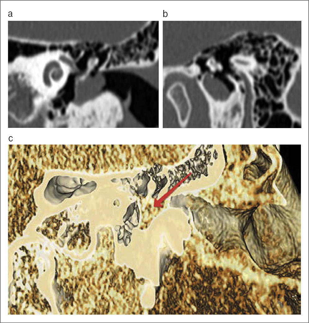 Рис. 2. КТ височных костей: а – образование в барабанной полости окутывает рукоятку молоточка; b – сагиттальная проекция; с – 3D-реконструкция (стрелкой показано новообразование).