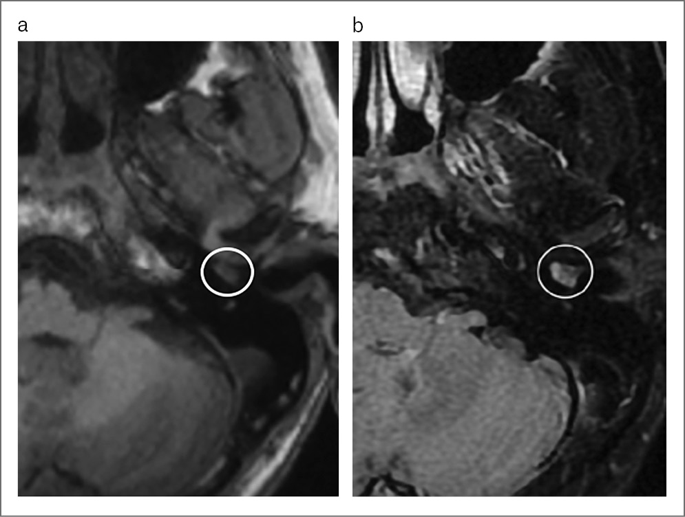 На КТ височных костей обычно в барабанной полости видна хорошо очерченная масса, без деструктивных изменений со стороны окружающей кости. По данным МРТ новообразование показывает низкую или среднюю интенсивность сигнала на Т1-ВИ, высокую интенсивность сигнала на Т2-ВИ и усиление сигнала после введения контраста. Новообразование может окутывать слуховые косточки, блокируя звукопроведение.