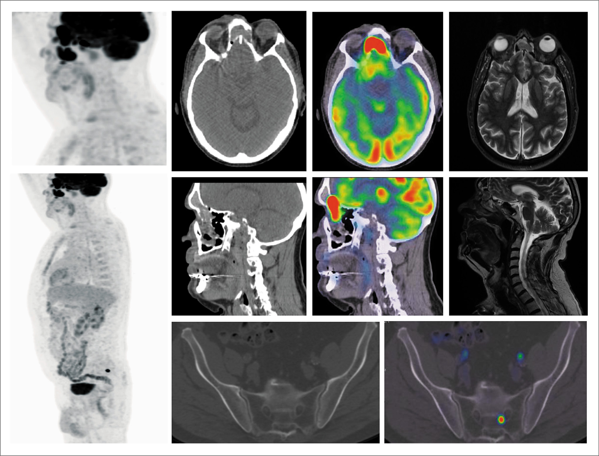 Произведена ПЭТ/КТ с 18F-фтордезоксиглюкозой. На фоне неравномерно утолщенной слизистой оболочки клеток решетчатого лабиринта, носовых раковин, верхнечелюстных и лобной пазух определяются гиперметаболические участки размером до 22×13 мм, SUVmax 19,1 – наибольший в области решетчатой пазухи и левой нижней носовой раковины с переходом на левую гайморову пазуху. Дополнительно в левой боковой массе крестца S2 определяется очаг повышенной фиксации радиофармпрепарата (РФП) без структурных изменений размером 15 мм, SUVmax 19,6 (рис. 1).