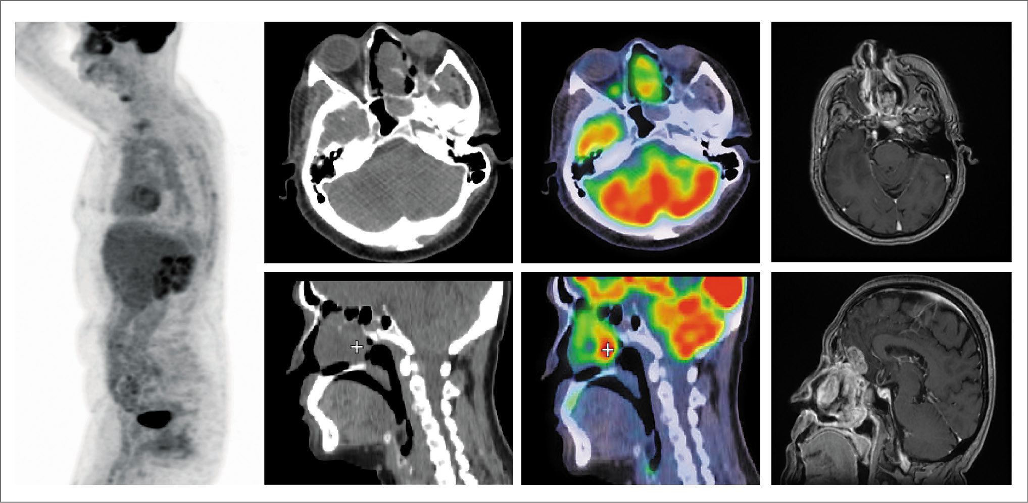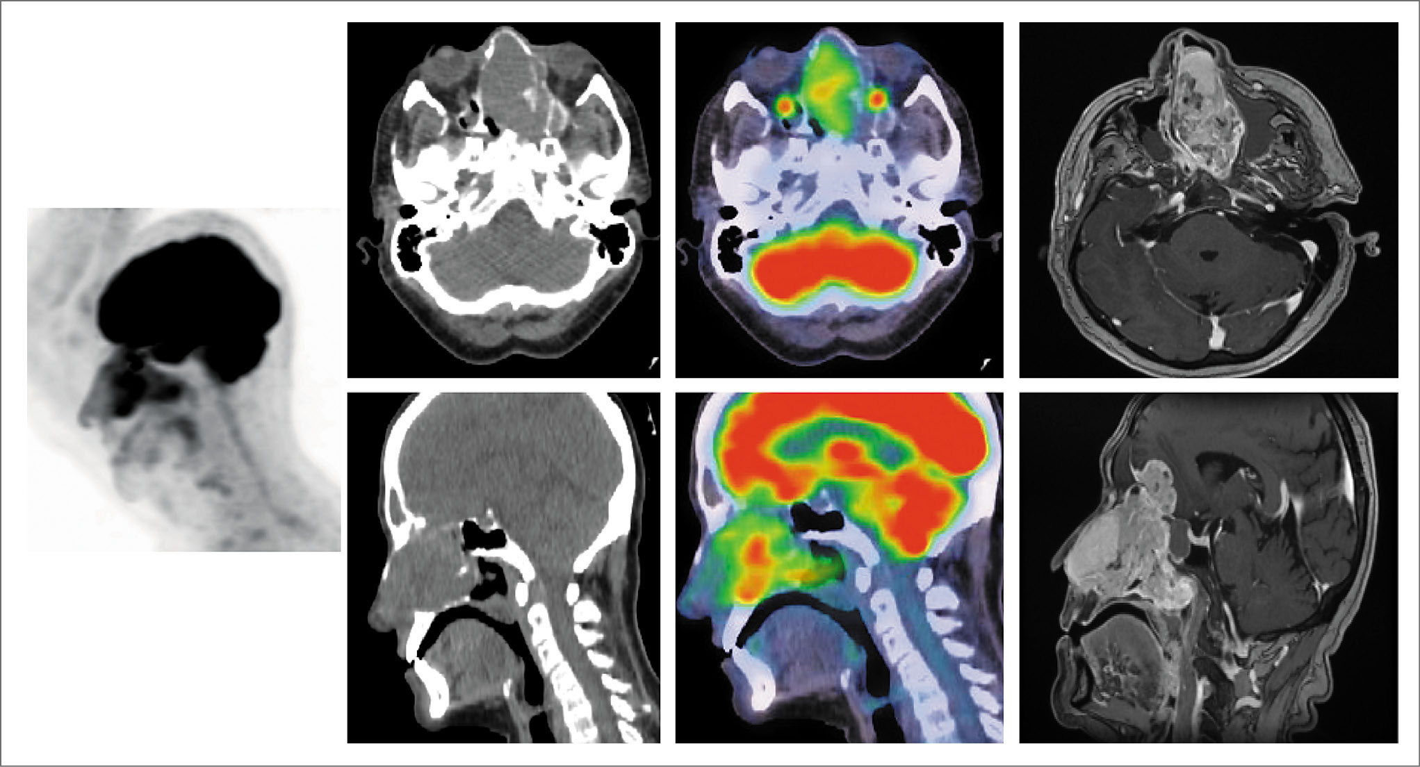 Для этой цели у больных применялись рентгеновская КТ, магнитно-резонансная томография и ПЭТ/КТ с 18F-фтордезоксиглюкозой. Из перечисленных методов медицинской визуализации ПЭТ/КТ позволяет уточнить истинную распространенность опухолевого процесса, особенно при вовлечении придаточных пазух носа, орбиты и интракраниальном переходе в переднюю черепную ямку. Кроме того, с помощью ПЭТ/КТ осуществляется объективная оценка эффекта проводимой терапии на протяжении всего курса лечения.