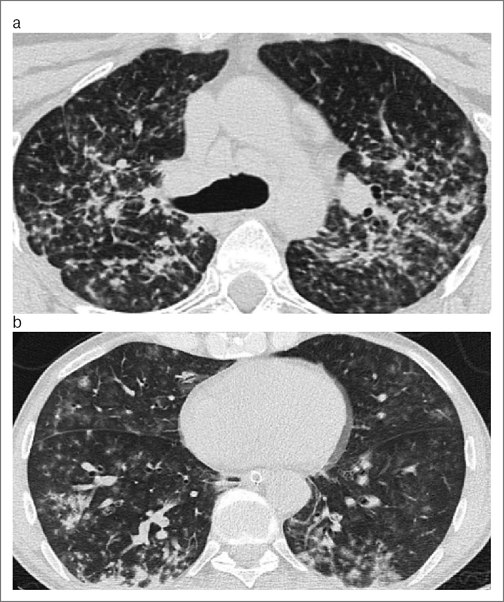3. Figure 2. CT scan of the chest. Axial projection, lung window mode: a – patient, age 26 years, with IVB stage of HIV infection with ID in the progression phase, without ART and with verified comorbidity of TOD, CMEP and CVEP; b – patient, age 28 years, with IVB stage of HIV infection with ID in the progression phase, without ART and with verified TOD and CMEP comorbidity.