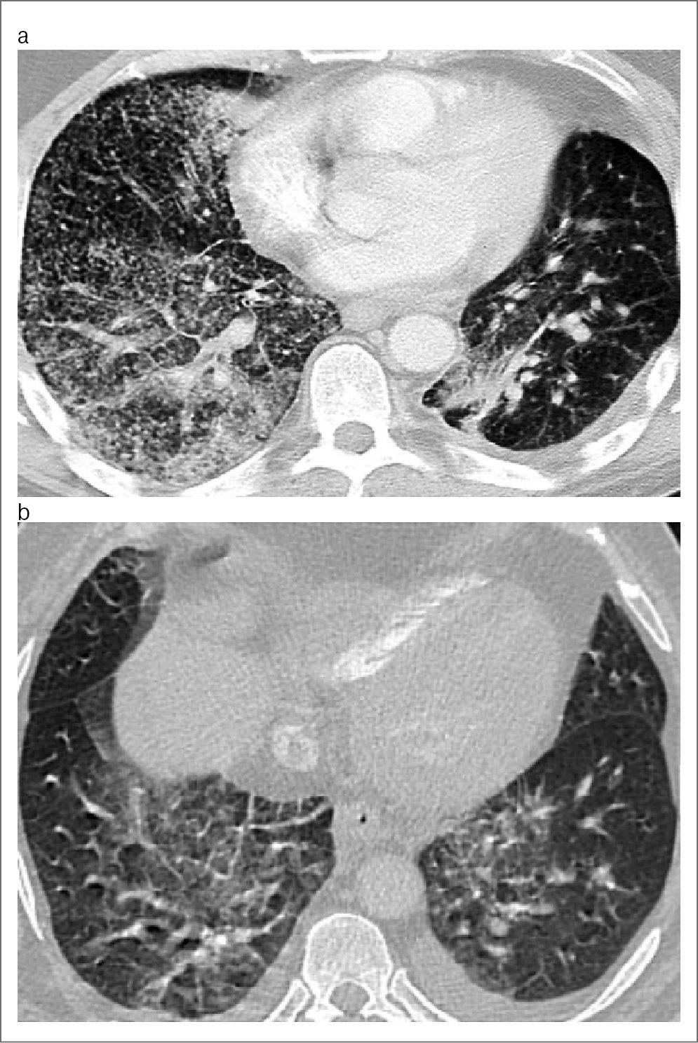 В качестве примеров приводим снимки КТ органов грудной клетки у больных IVВ стадией ВИЧ-инфекции с ИД в фазе прогрессирования и при отсутствии АРВТ, иллюстрирующие сходство визуализации патологических изменений в 1а и 1б группах (рис. 1, a, b) и в 2а и 2б группах (рис. 2, a, b).