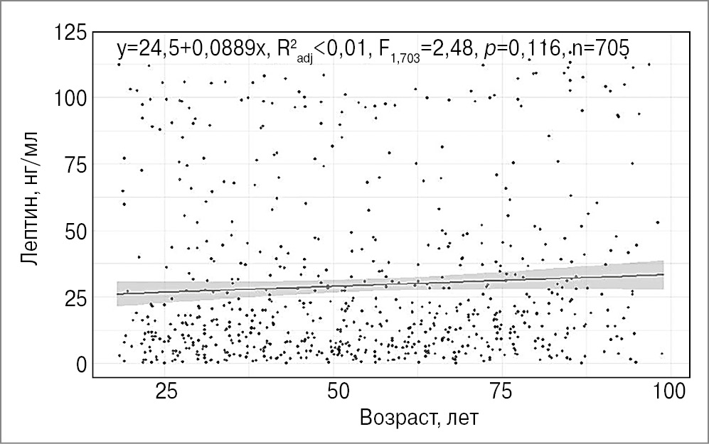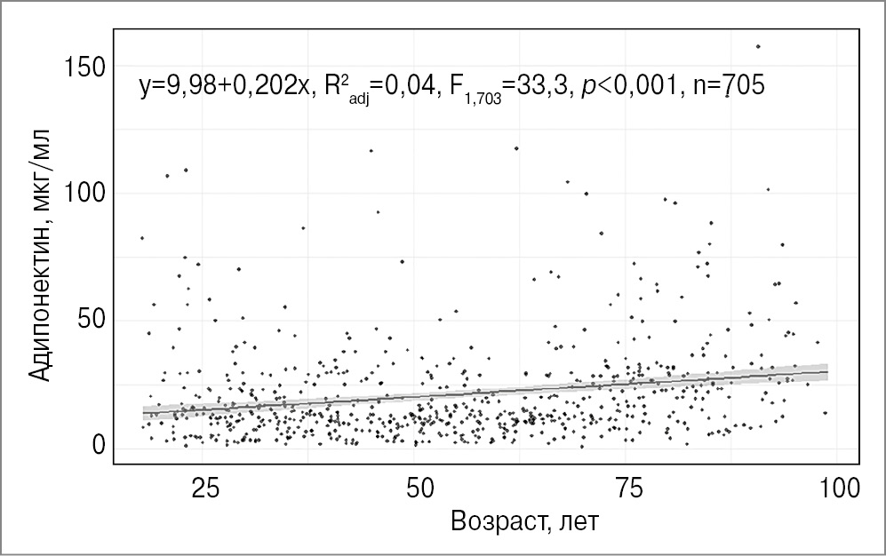 Результаты. В исследование включены 711 участников, которые распределены на 8 возрастных групп. По данным межгруппового сравнения выявлена статистически значимая прямая связь возраста с адипонектином (p<0,001), глюкозой (p<0,001) и гликированным гемоглобином (p<0,001). Значимая корреляция с возрастом не выявлена у лептина (p=0,116), инсулина (p=0,078) и КМЛ (p=0,506). После проведения статистического анализа методом построения линейных регрессий для оценки зависимости переменных от возраста установлено, что только адипонектин, глюкоза и гликированный гемоглобин значимо повышаются с возрастом (p<0,001).