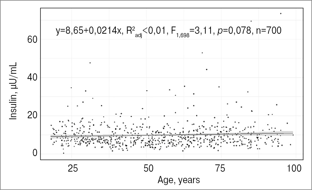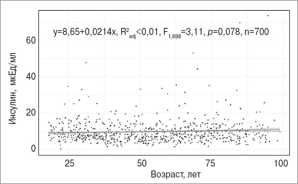Полученные результаты показали отсутствие значимых изменений инсулина с возрастом (p=0,078). В исследовании D. Muller и соавт. на 771 добровольце от 20 до 96 лет также не выявлено корреляции возраста с уровнем инсулина натощак [13]. Вероятно, cхожие с нашими результаты получены вследствие анализа в похожих возрастных диапазонах с равномерным распределением лиц разных возрастов. Помимо этого, два исследования проводились на изолированных группах молодых (23,7±0,8 года, 28±1 год) и пожилых (70,1±0,7 года, 70±1 год) людей общим числом 291 человек [14, 19]. В обоих случаях результаты показали, что ни концентрация инсулина натощак, ни пиковая концентрация не различались между группами. Таким образом, несмотря на различные дизайны исследований и размеры выборок, общая тенденция к отсутствию корреляции инсулина с возрастом прослеживается во многих работах и подтверждается в нашем исследовании. Показано, что поддержание стабильного низкого уровня инсулина и минимизация активности его сигнальных путей способствуют увеличению продолжительности жизни [2]. Так, долгожители имеют низкие уровни инсулина натощак и более высокую чувствительность к нему по сравнению с пожилыми людьми [4]. Высокие концентрации инсулина приводят к клеточному стрессу и преждевременному старению в ходе избыточного липогенеза, накопления нефункциональных полипептидов, нарушения аутофагии, дисфункции митохондрий и повышения уровня свободных радикалов [2].