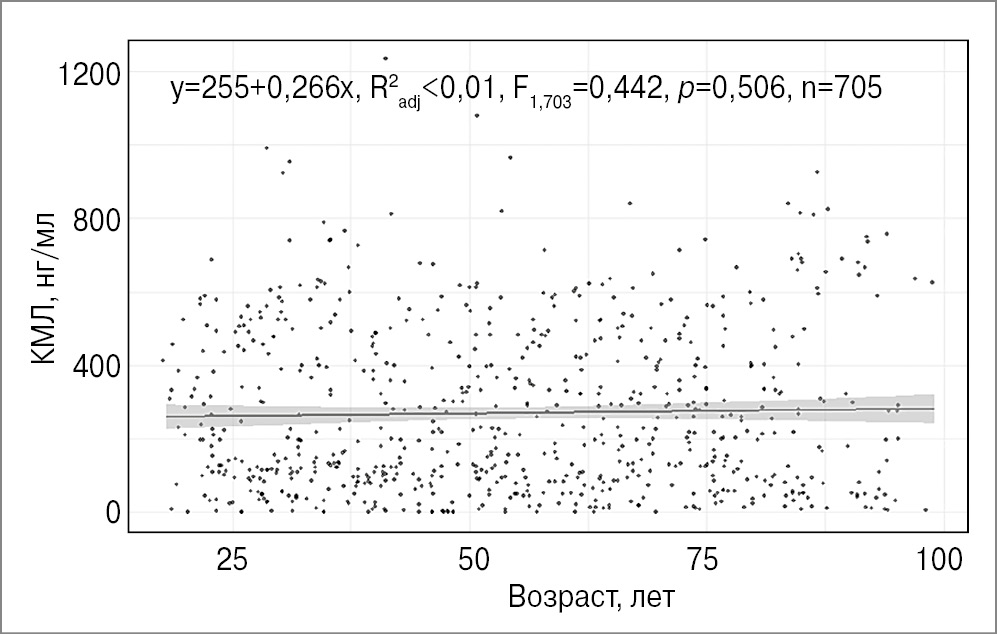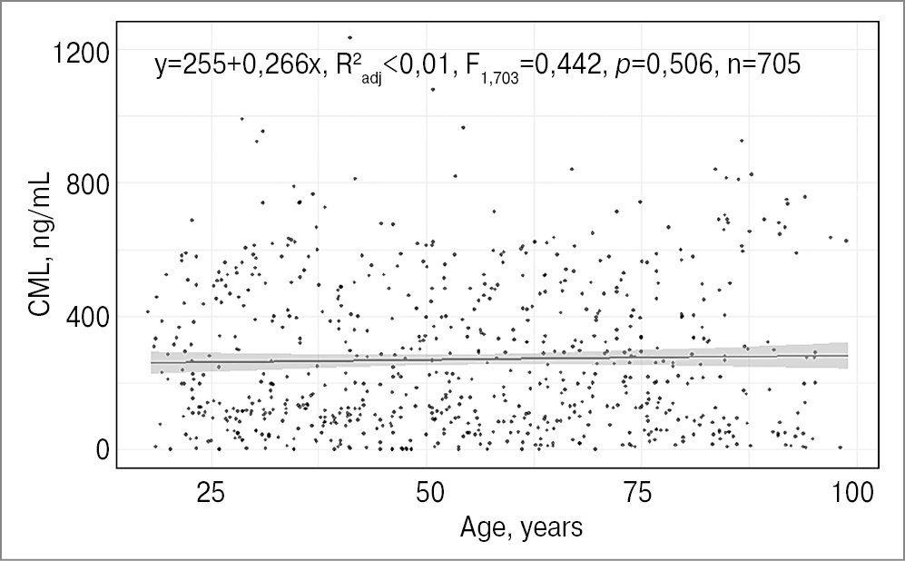 По нашим данным, КМЛ не изменяется значимо в возрастных группах (p=0,506), однако аналогичные по дизайну работы выявили его повышение. Одно из исследований проводилось в Китае на 1196 образцах плазмы крови доноров. В нем выявлена значимая положительная корреляция КМЛ с возрастом у мужчин (p<0,001), но не у женщин (p=0,053) [20]. В отличие от нашего исследования здесь отсутствовал отбор образцов исключительно от здоровых пациентов, что могло исказить результаты. Другие два исследования проводились в США на участниках от 18 до 45 и старше 60 лет, число составило 325 и 172 соответственно [21, 22]. Оба исследования в отличие от RUSS-AGE проводились на небольших выборках, а также изучали отдельные возрастные группы, что важно учитывать из-за большой вариабельности КМЛ, подтвержденной нашими данными. Также оба исследования проводились в Америке, где типичный рацион питания существенно отличается от российского, а на уровень КМЛ влияет его количество в потребляемой пище [23]. Накопление КМЛ негативно влияет на состояние организма из-за его способности повреждать ткани в ходе модификации структуры белка, его конформации, образования свободных радикалов и индуцирования хронического воспаления [3].