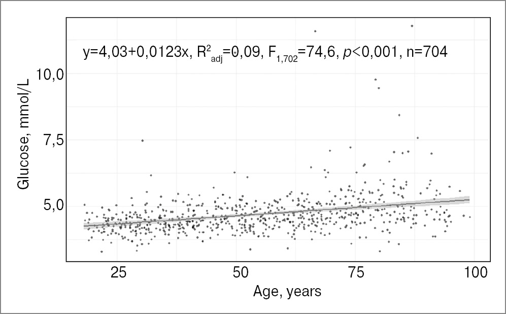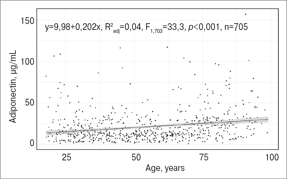 Изменения метаболизма глюкозы оказывают влияние на секрецию инсулина, повышенные концентрации которого приводят к значительному клеточному стрессу, дисфункции митохондрий и повышенному образованию свободных радикалов [1, 2]. Также гиперинсулинемия и сопутствующая ей инсулинорезистентность являются важными факторами риска сахарного диабета 2-го типа (СД 2) и сердечно-сосудистых заболеваний. В работах на мышиных моделях и людях показано, что повышенные концентрации инсулина преобразуют фенотип гепатоцитов, адипоцитов и нейронов на характерный для стареющих клеток [2]. Таким образом, инсулин может играть существенную роль в развитии возрастных заболеваний и ускорении темпов старения. С учетом прямой связи гликированного гемоглобина (HbA1c) с уровнем глюкозы он также является предиктором многих возраст-ассоциированных заболеваний. Также некоторые пути формирования карбоксиметиллизина (КМЛ), относящегося к конечным продуктам гликирования, требуют участия глюкозы [3]. Роль КМЛ в процессах старения и развитии возраст-ассоциированных заболеваний является предметом научных дискуссий. Неоспорима связь углеводного обмена и жировой ткани, возрастные изменения клеточных процессов которой влияют на синтез и секрецию адипокинов. Одним из них является адипонектин, который обладает большим влиянием на процессы метаболизма и общее состояние организма [2]. Показано, что он повышает чувствительность к инсулину, предупреждая развитие СД 2, благоприятно влияет на липидный профиль и обладает антиатеросклеротическим эффектом [4, 5]. Все перечисленное свидетельствует о роли адипокина в процессе старения, поэтому изучение трендов его изменений имеет большое значение.