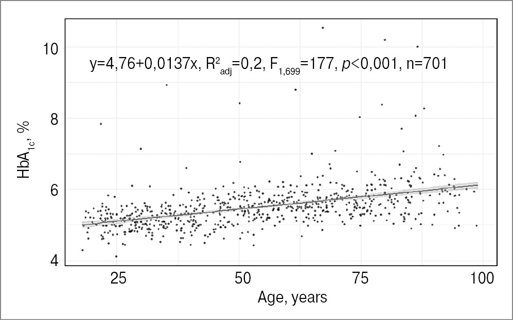 Помимо этого, наши результаты показывают повышение HbA1c с возрастом. Аналогичные результаты показаны в ходе анализа множественной линейной регрессии в исследовании на 4748 жителях Тайваня в возрасте от 30 до 70 лет [17]. В американском исследовании на 5743 участниках также получена положительная корреляция с возрастом, при этом увеличение уровня HbA1c составило 0,010–0,014 единиц в год в зависимости от популяции [18]. В то же время в китайском исследовании в ходе линейного регрессионного анализа показано, что уровни HbA1c увеличиваются в среднем на 0,020% за 10 лет. Эти данные получены на 18 265 пациентах, у которых ранее не диагностирован СД [18]. Таким образом, полученные нами результаты подтверждены во всех перечисленных исследованиях, а также при участии людей разных национальностей, что позволяет сделать вывод о достоверности полученного нами тренда. Это, вероятно, связано с возрастной гипергликемией, которая ведет к повышению уровня HbA1c [1]. Также на повышение уровня HbA1c может оказывать влияние увеличение скорости гликирования, связанное со старением [18].
