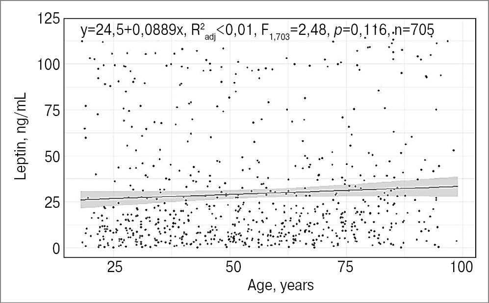 Наше исследование не показало значимых изменений концентрации лептина с возрастом. Однако в аналогичной работе показано, что уровень в плазме крови у пациентов старше 60 лет снижен на 53% по сравнению с более молодой группой [10]. В двух других работах выявлены половые различия в тенденциях изменения лептина. Так, в американском исследовании показано возрастное повышение лептина у женщин, без его изменения у мужчин, а в польском исследовании, наоборот, он повышался у мужчин, у женщин же корреляция с возрастом не выявлена [11, 12]. По сравнению с RUSS-AGE оба исследования проведены на гораздо меньших выборках – 70 и 114 человек.