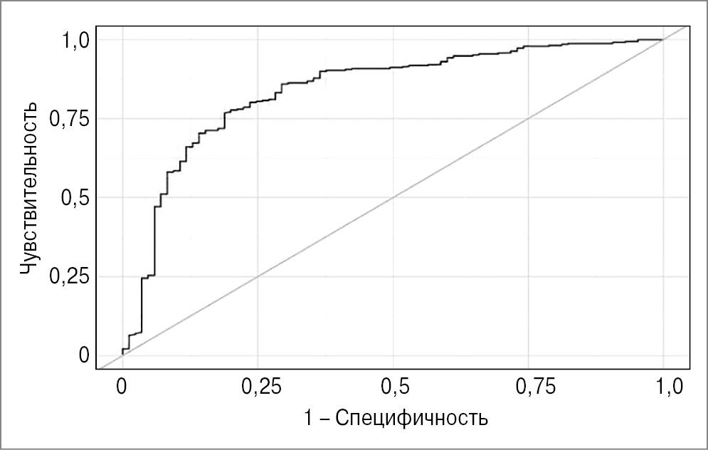 Площадь под ROC-кривой составила 0,840±0,020 с 95% доверительным интервалом –ДИ 0,800–0,879. Полученная модель являлась статистически значимой (p<0,001).