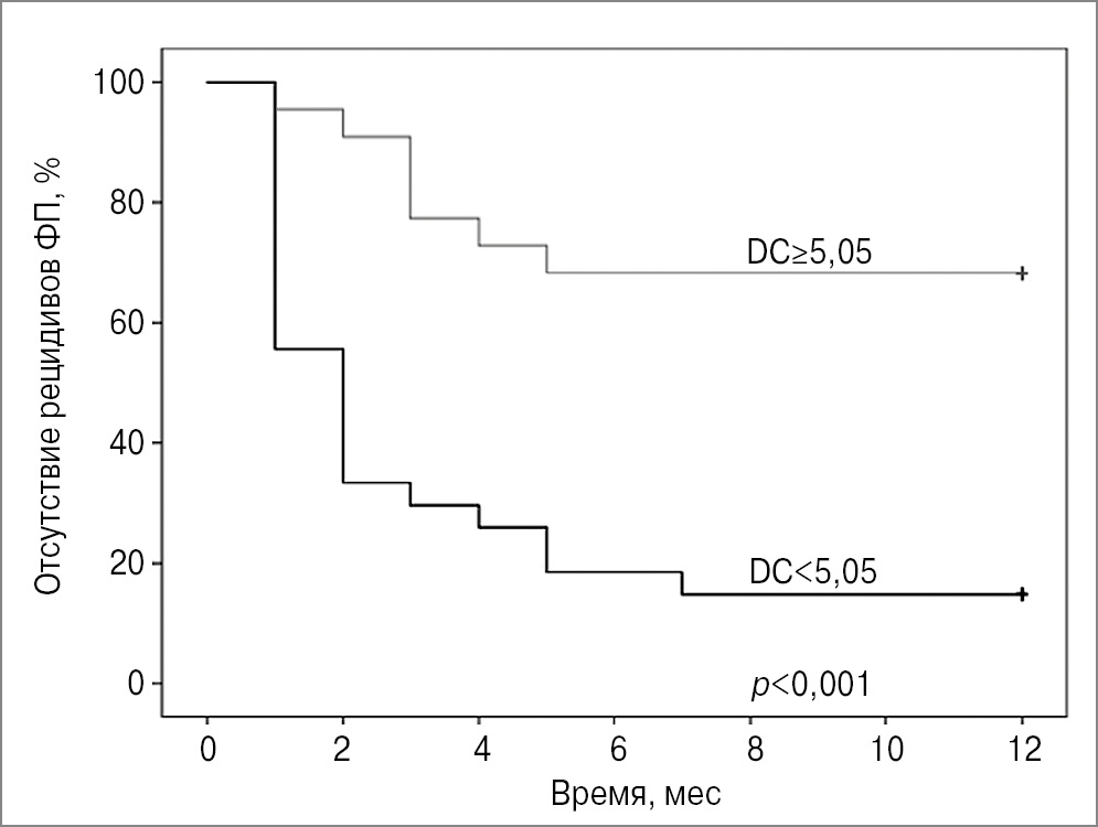 Для определения прогностической значимости различных факторов риска проведены ROC-анализ (табл. 3), расчет ОШ и построение кривых выживаемости. Наибольшей силой характеризовалась математическая модель, использующая значение DC (AUC=0,742); см. табл. 3. Пороговое значение DC, большее или равное 5 мс, с 79% чувствительностью и 77% специфичностью предсказывало эффективность терапии ААП IC класса, ОШ составило 12 (ДИ 3,07–49,5); p<0,0001). Среди наших больных с DC выше 5 мс эффективность ААП IC класса наблюдалась в 68,2% случаев, а ниже 5 мс – лишь в 14,8%. При анализе эффективности терапии по методу Каплана–Мейера наблюдалось достоверное различие кривых (p<0,0001), отображающих возникновение рецидива ФП (рис. 1).
