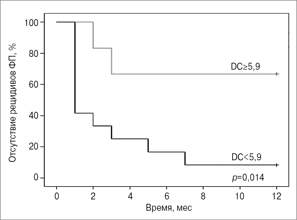 В группе Э абсолютные значения DC оказались достоверно выше в группе Эфф+. По результатам ROC-анализа (AUC 0,831; p=0,034) показатель DC характеризовался высокой чувствительностью (80%) и специфичностью (85%) для порогового значения 5,9 мс. При значениях DC выше данного значения вероятность эффективности терапии Э увеличивалась в 22 раза (ОШ 22 (95% ДИ [1, 5; 314]); p=0,009). При анализе по методу Каплана–Мейера достоверно различались кривые свободы от рецидивирования ФП у больных с DC выше и ниже порогового значения (рис. 3).