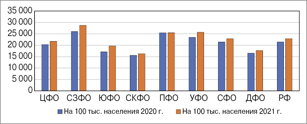 Отмечена негативная динамика смертности от БОД, более выраженная на протяжении последних 2 лет на фоне пандемии коронавирусной инфекции (рис. 4). Следует обратить особое внимание на рост показателя в Южном, Приволжском, Сибирском, Дальневосточном ФО. Дальнейшее планирование выездной и аналитической деятельности НМИЦ будет проводиться с учетом изложенного, а также в тесном взаимодействии с главными внештатными специалистами (ГВС) данных округов.