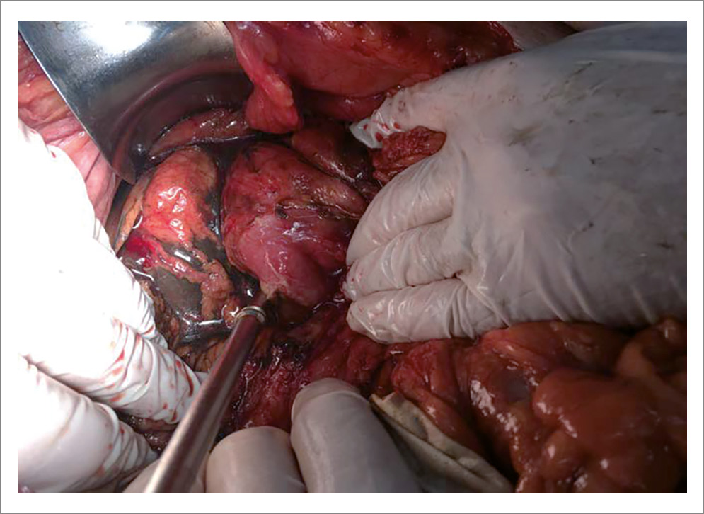 В последующем обнаружен ход, проявляющийся имбибицией окружающих тканей нисходящего отдела ДПК вдоль задней ее стенки. При разделении имбибированных тканей грязного цвета на верхней стенке луковицы с переходом на переднюю выявлено отверстие 0,8 на 0,3 см (рис. 2). В верхней ее части язвенный дефект прикрыт стенкой желчного пузыря. Вдоль луковицы ДПК имеются следы фибрина, стенка ДПК инфильтрирована, отечная.