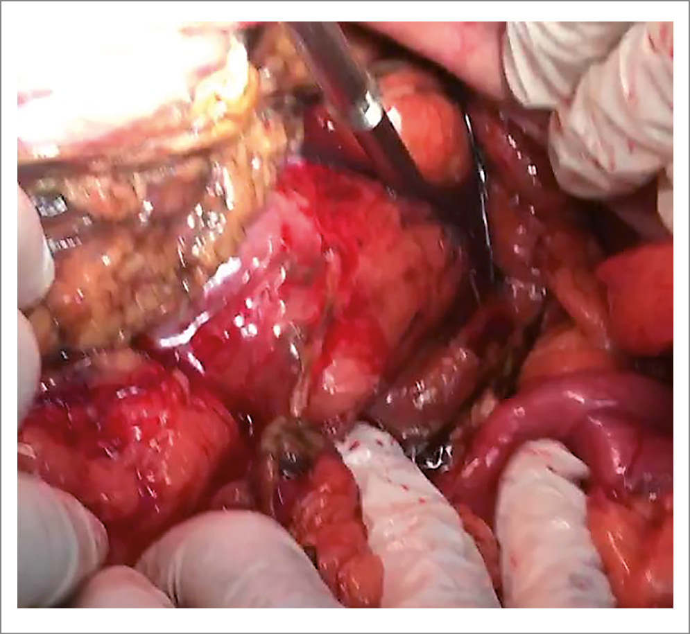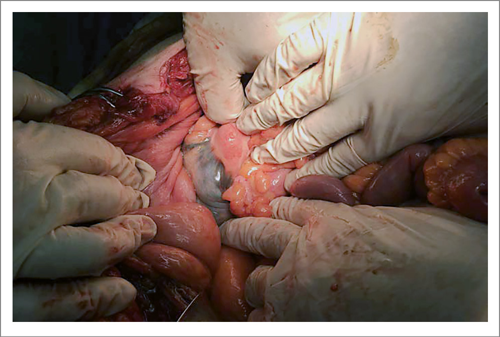 При поступлении отмечается выраженная дегидратация (гемоконцентрация: гематокрит – 52,3%, гемоглобин – 177 г/л, центральное венозное давление резко отрицательное), на электрокардиограмме – ФП (пароксизм менее 48 ч) на фоне относительно стабильной гемодинамики, одышка – до 30 дыханий в 1 мин, SpO2 – 89%. При рентгенографии наблюдаются признаки частичной кишечной непроходимости, свободного газа в брюшной полости не обнаружено. В ходе предоперационной подготовки состояние стабилизировано, проведена инфузионная терапия, декомпрессия желудка, восстановлен синусовый ритм (введение раствора амиодарона в дозе 300 мг внтуривенно капельно), при оксигенотерапии уменьшилась одышка и восстановилась сатурация до 98%. После этого больной поступил в операционную с диагнозом – «тромбоз мезентериальных сосудов кишечника? Ятрогенное повреждение кишечника при выполнении троакарной эпицистостомии 18.11.2022?».