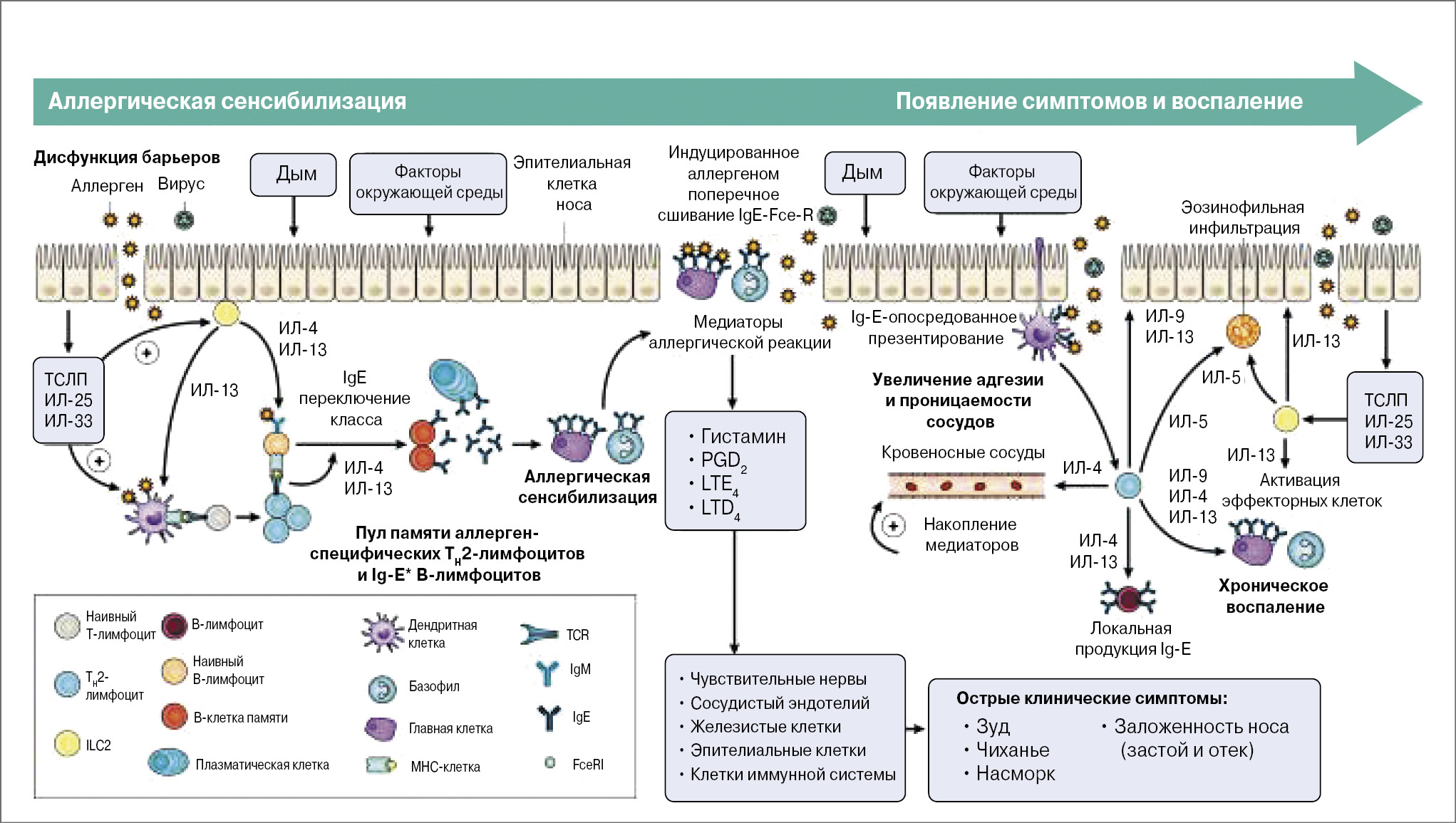 - Воспалительный ответ при АР связан как с Т2-адаптивным, IgE-опосредованным иммунным ответом, так и с врожденным иммунным ответом, обусловленным врожденными лимфоидными клетками 2-го типа (ILC2). Эти ответы объединяют общие Т2-цитокины: интерлейкины (ИЛ)-4, 5, 13, способствующие развитию эозинофильного воспаления [8]. Адаптивный иммунный ответ достаточно изучен. Дендритная клетка (DC) захватывает аллерген/антиген и в составе главного комплекса гистосовместимости 2-го типа представляет наивным Т-хелперам (Th0) в регионарных лимфоузлах в окружении ИЛ-4. Последний продуцируется тучными клетками и базофилами, особенно его много в мукозассоциированой лимфоидной ткани. Th0 в присутствии ИЛ-4 дифференцируются в Th-2, экспрессируется транскрипционный фактор GATA-3, и Th-2 продуцируют провоспалительные Т-цитокины ИЛ-5, 4, 13. ИЛ-5 способствует созреванию эозинофилов и рекрутированию их в очаг воспаления. ИЛ-4, 13 стимулируют наивные В-лимфоциты, которые трансформируются в плазматические клетки с синтезом IgM и последующим переключением на синтез IgE. Параллельно образуется пул клеток памяти (Т- и B-клетки). С клетками памяти связан тот факт, что при повторном воздействии аллергена для возникновения симптомов требуется постепенно меньшее количество аллергена. IgE взаимодействует с высокоаффинными рецепторами на тучных клетках и базофилах, фиксируется и может длительно находиться на поверхности этих клеток. При повторном поступлении антигена происходит перекрестная сшивка антител, далее активация тучных клеток и базофилов, биохимическое превращение мембранных липидов и синтез медиаторов ранней фазы (гистамина, фактора активации тромбоцитов, простагландинов), что ведет к местному расширению сосудов, повышению проницаемости сосудов, спазму гладкой мускулатуры, гиперпродукции слизи, раздражению нервных окончаний. Замедление кровотока и экспрессия молекул клеточной адгезии на эндотелии и лейкоцитах обеспечивают миграцию клеток из сосудистого русла в ткань. Через 8–12 ч развивается поздняя воспалительная реакция с участием базофилов и тучных клеток, которые синтезируют лейкотриены, цитокины, хемокины. Медиаторы поздней фазы рекрутируют Тh-2, эозинофилы, макрофаги, нейтрофилы и другие лейкоциты в очаг аллергического воспаления. Накопление медиаторов воспаления в тканях, клетки памяти, персистенция аллергена способствуют хронизации воспаления. Медиаторы ранней и поздней фазы обусловливают клинические проявления АР. Врожденный иммунный ответ связан с тем, что поврежденный эпителий активирует эпителиальные алармины: тимус стромальный лимфопоэтин, ИЛ-33, 25. Эпителиальные алармины способствуют синтезу врожденными лимфоидными клетками 2-го типа (ILC2) провоспалительных Т2-цитокинов, опосредуя эозинофильное воспаление. Вероятно, этот путь связан с тем, что эозинофильное воспаление при АР может поддерживаться даже без воздействия аллергена, способствуя хроническому течению. Врожденный и адаптивный иммунные ответы являются равнозначными механизмами развития воспаления при аллергических заболеваниях [7].